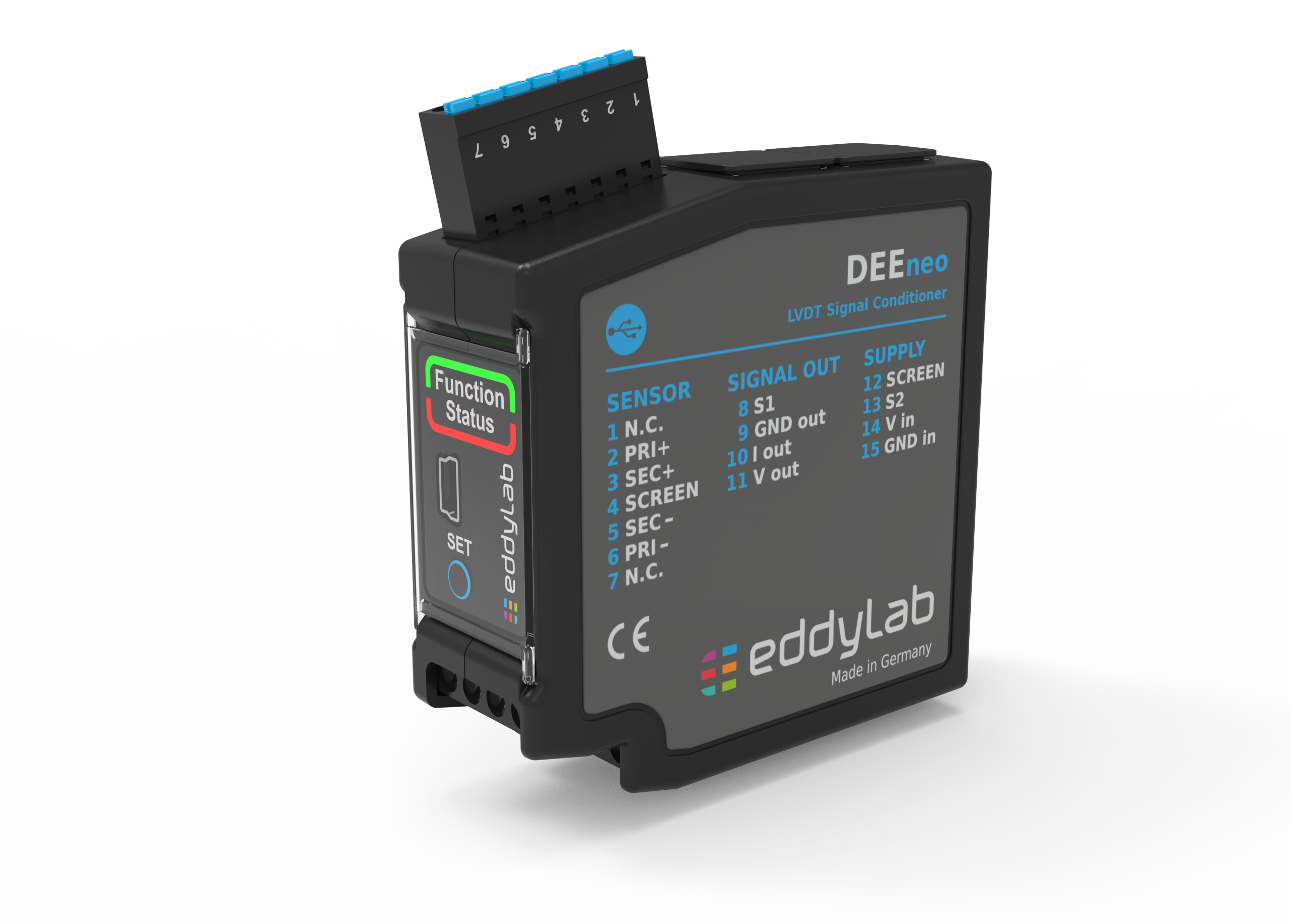 Der Trägerfrequenz-Messverstärker DEEneo wurde entwickelt für den Betrieb von induktiven Sensoren nach dem LVDT-Prinzip (Vollbrücke). Die Elektronik übernimmt die Sensorversorgung und wandelt das Sensorsignal mit Hilfe eines Mikrocontrollers in ein normiertes, analoges Ausgangsignal.
